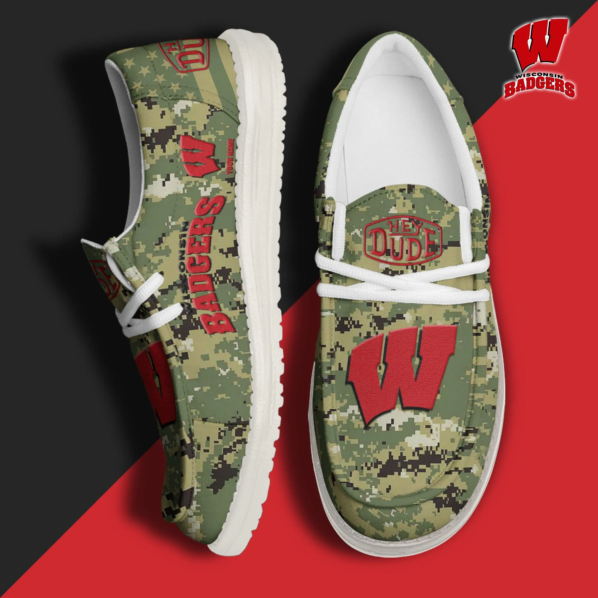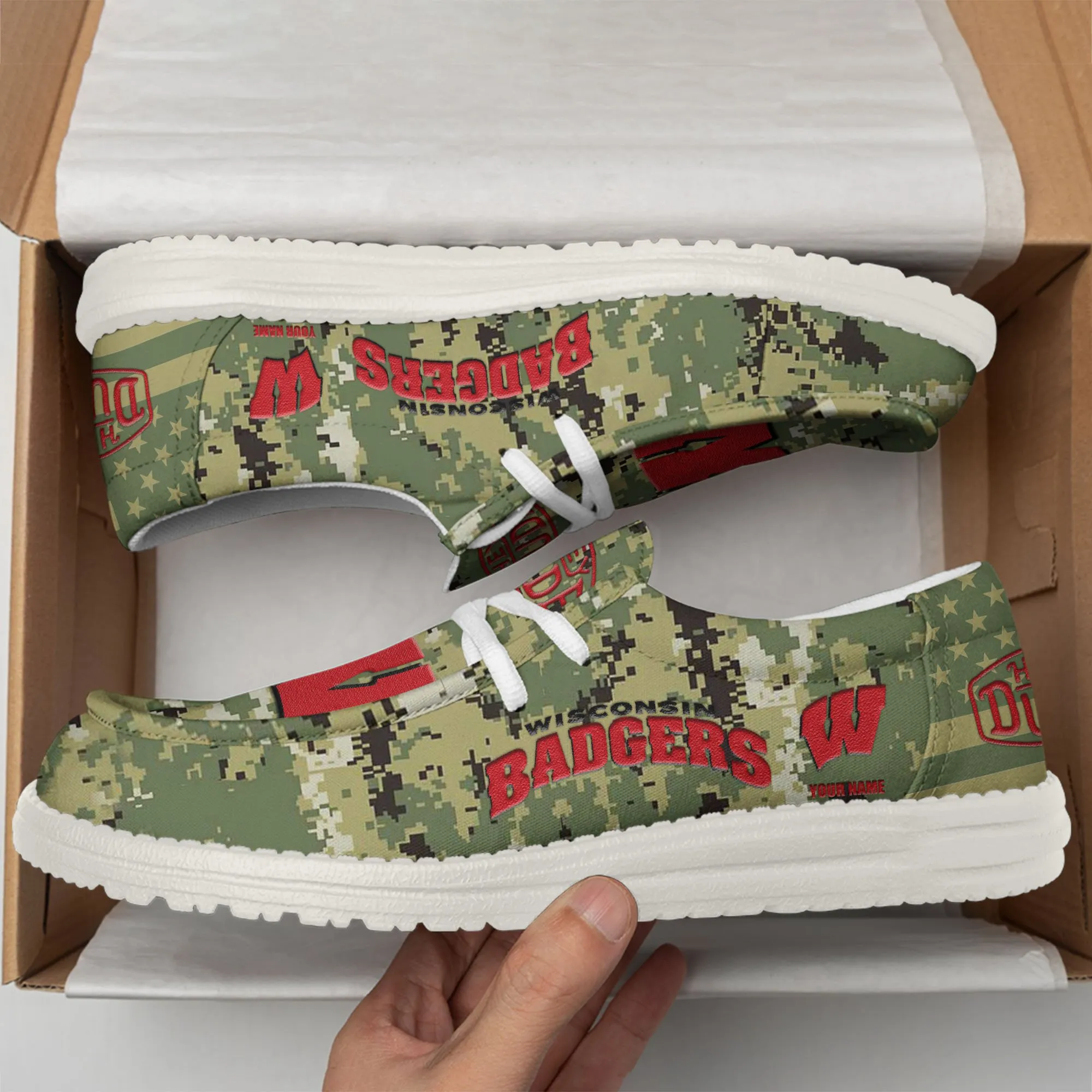 Wisconsin Badgers 3D Print Dude Shoes Camo Green Best Gift For Sport Fan