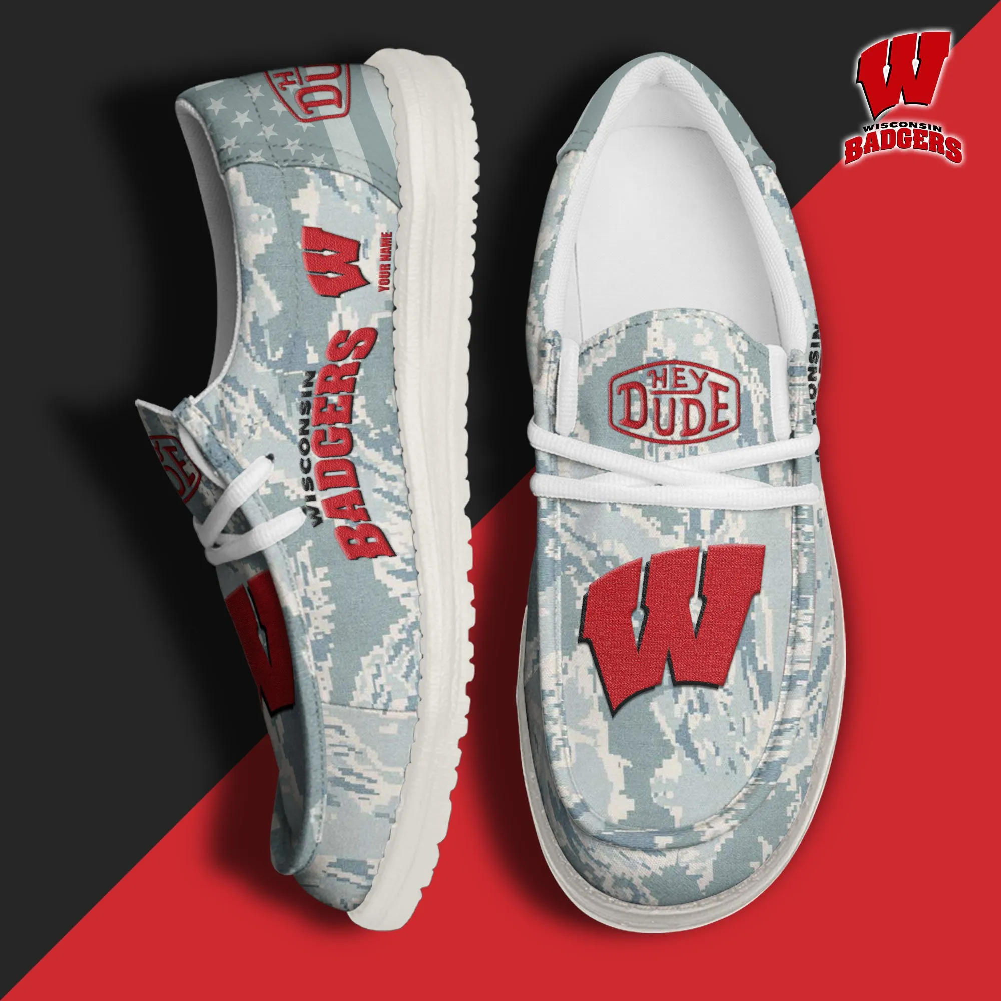Wisconsin Badgers 3D Print Dude Shoes Camo Blue Grey For Men Women