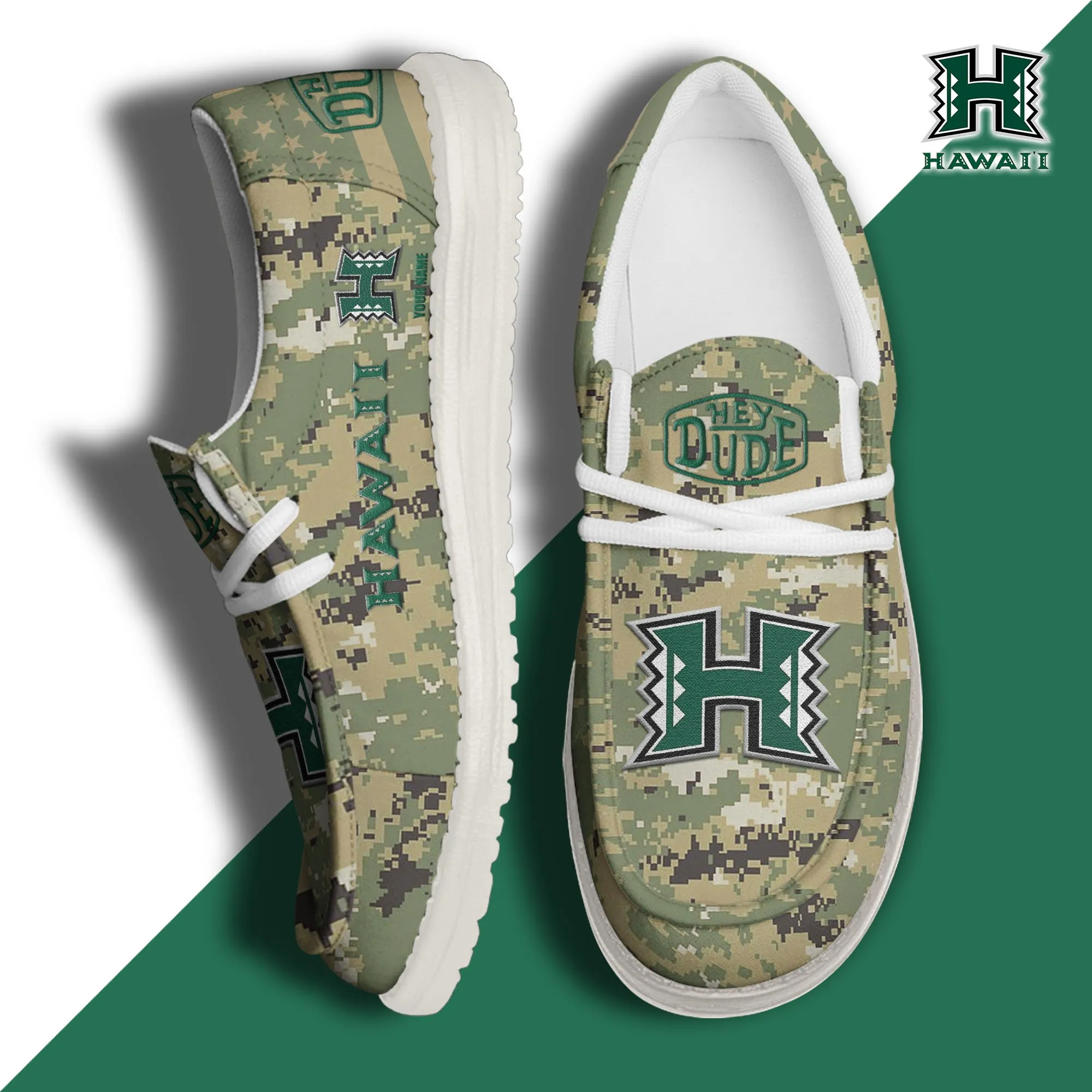Hawaii Rainbow Warriors 3D Print Dude Shoes Camo Green For Men Women