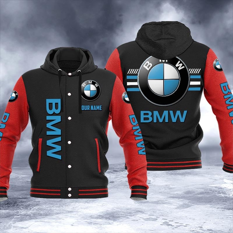 BMW Custom Name Hooded Baseball Jacket For Fans Red Black