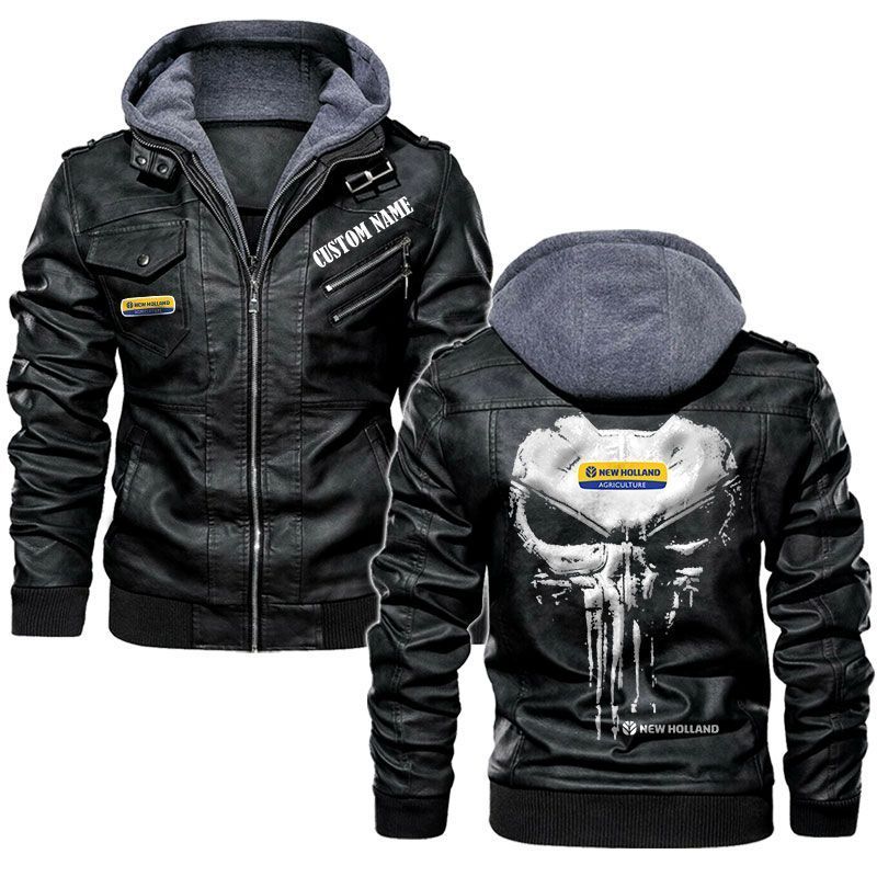 Custom Name Punisher Skull New Holland Agriculture Hooded Leather Jacket