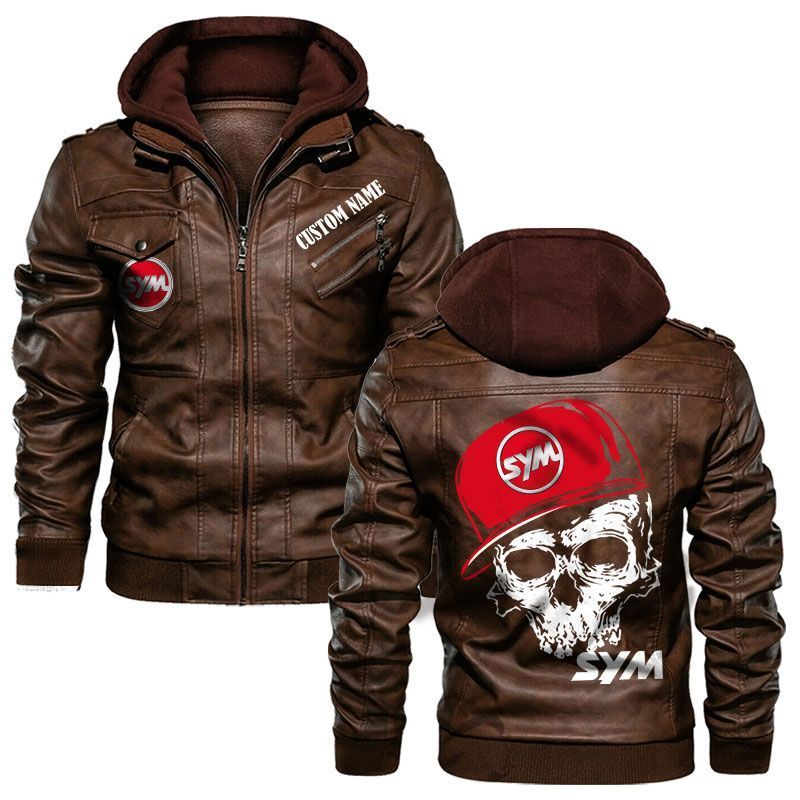 Custom Name Skull Design SYM Motors Hooded Leather Jacket