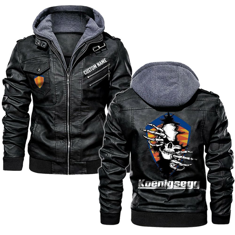 Koenigsegg Custom Name Skull Biker Car Driver Personalized Hooded Leather Jacket For Men Women