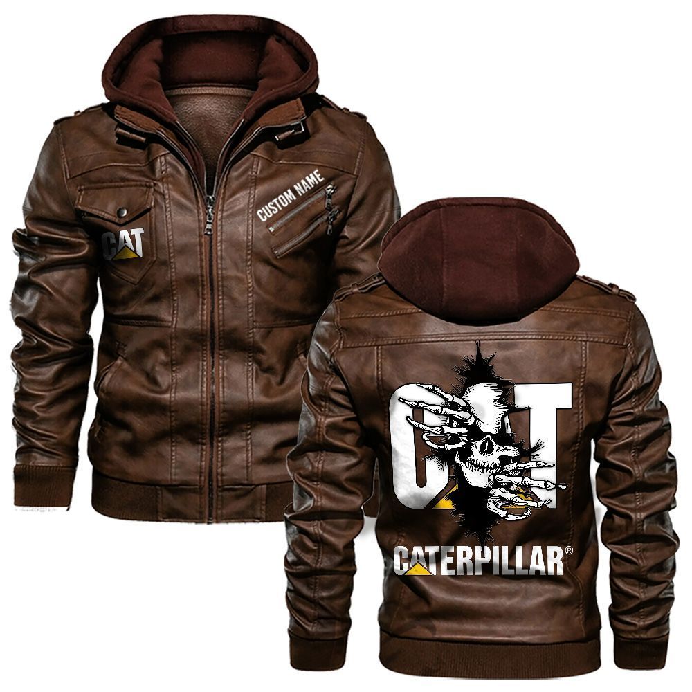 Caterpillar Inc Custom Name Skull Biker Car Driver Personalized Hooded Leather Jacket For Men Women