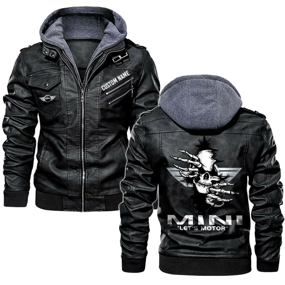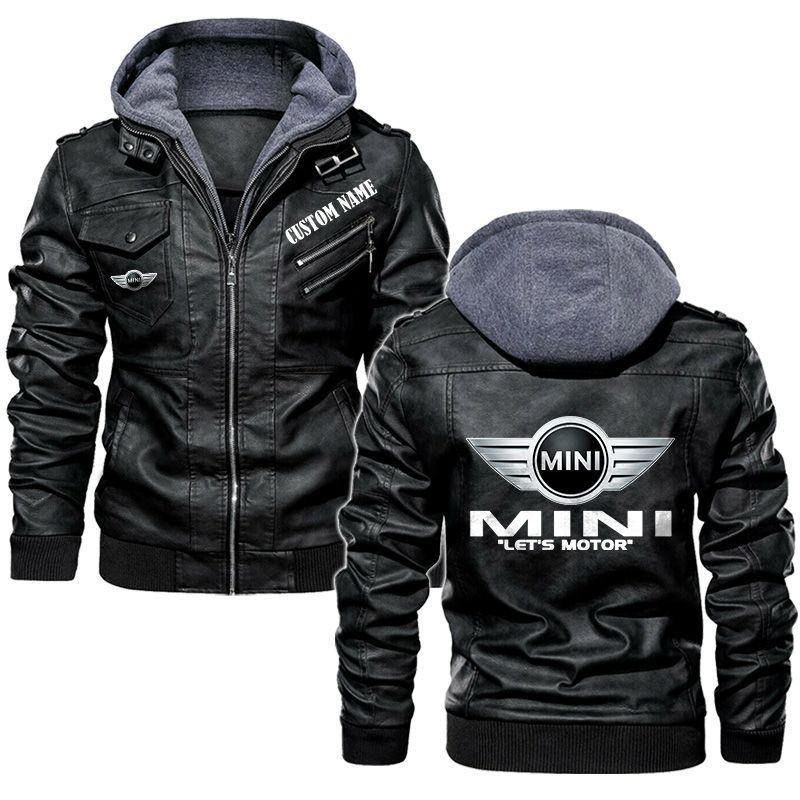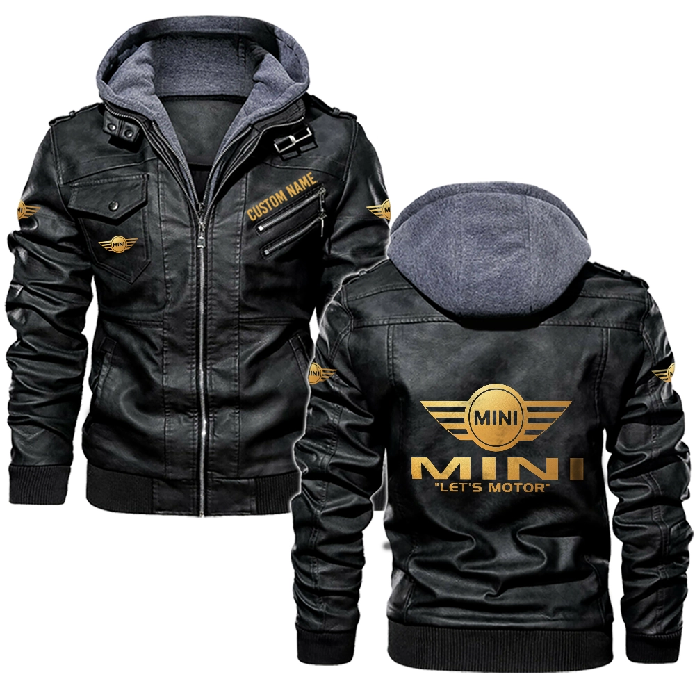 Mini Cooper Golden Logo Custom Hooded Leather Jacket Black
