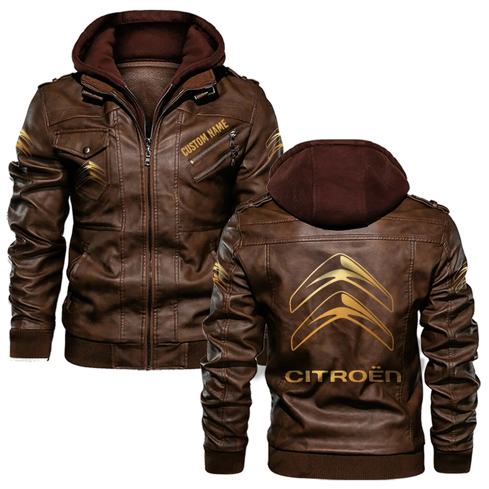 Citroen Golden Logo Custom Hooded Leather Jacket Brown