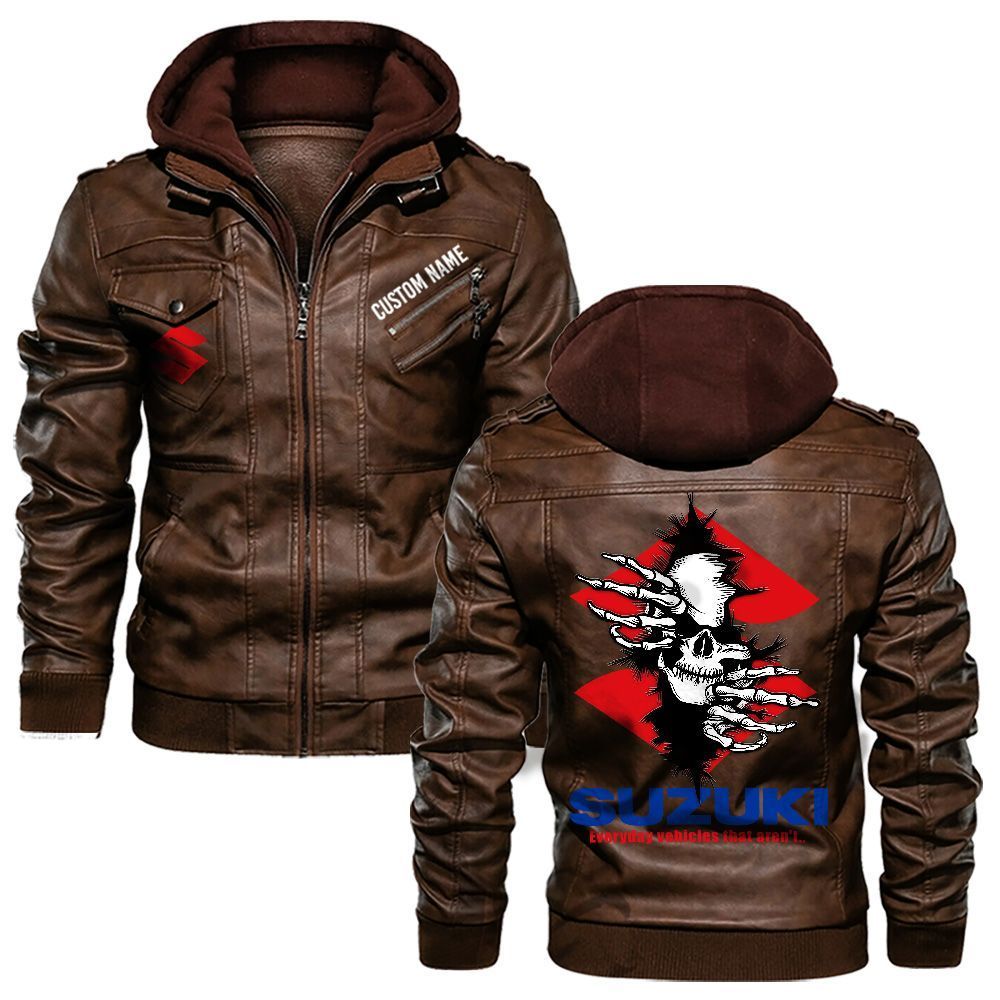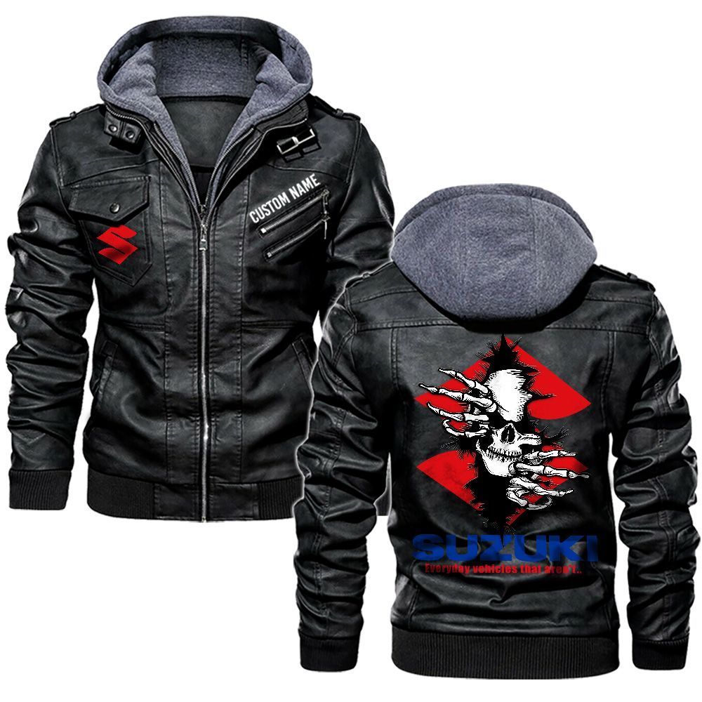 Suzuki Custom Name Skull Biker Car Driver Personalized Hooded Leather Jacket For Men Women