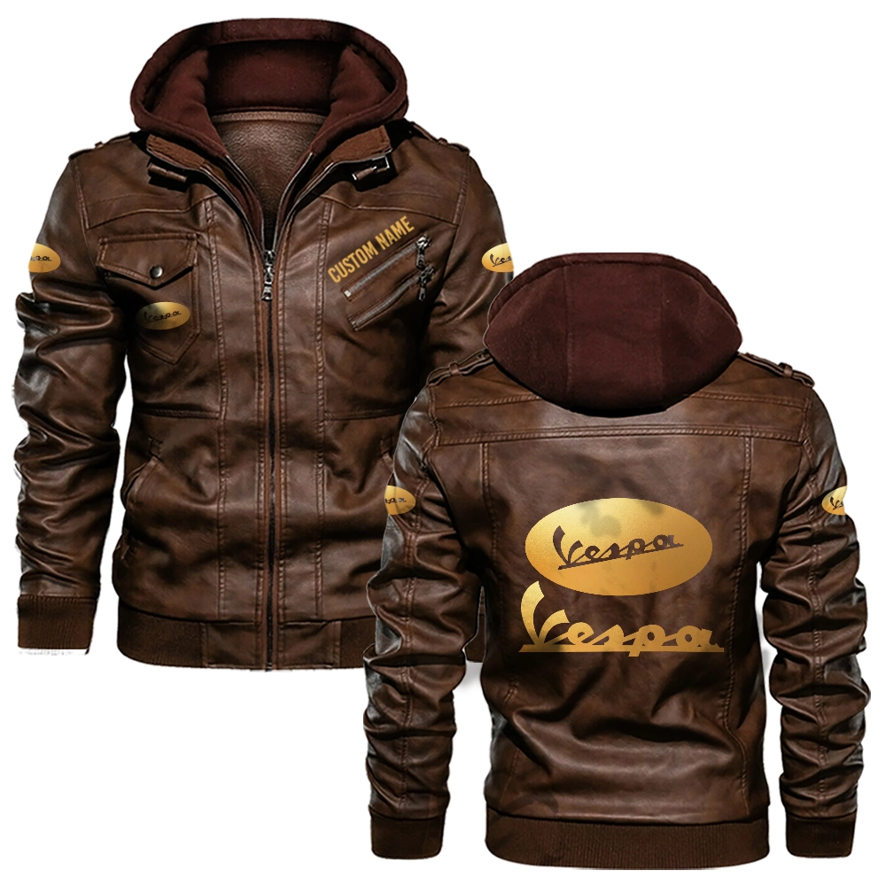 Vespa Golden Logo Custom Hooded Leather Jacket Brown