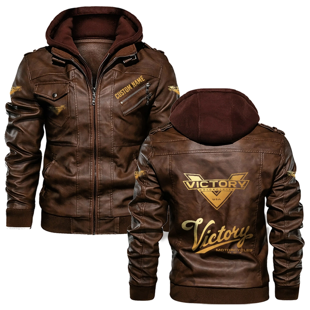 Victory Motorcycles Golden Logo Custom Hooded Leather Jacket Brown