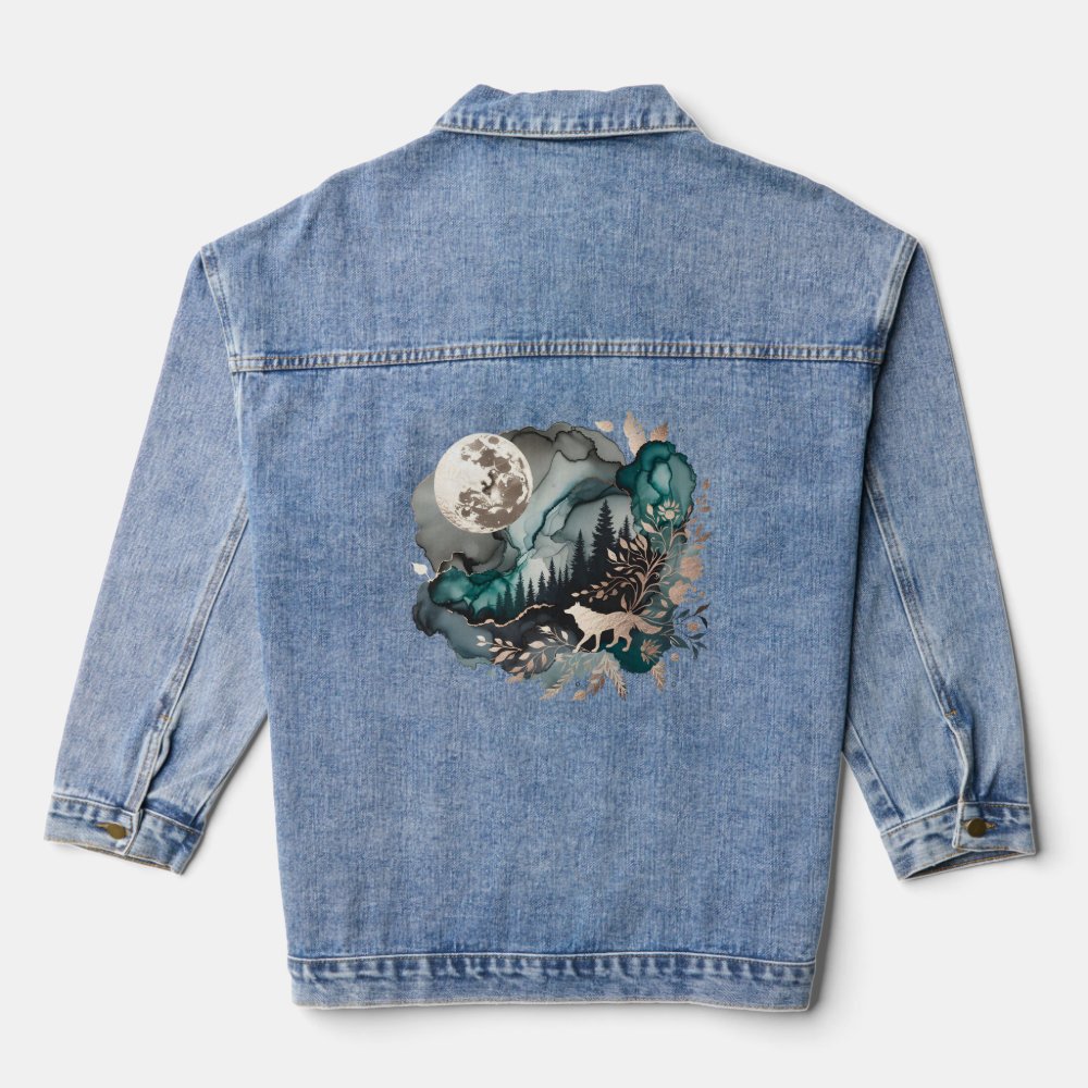 Wolf Landscape With Moon Gold N Teal Denim Jacket Best Outerwear Gift