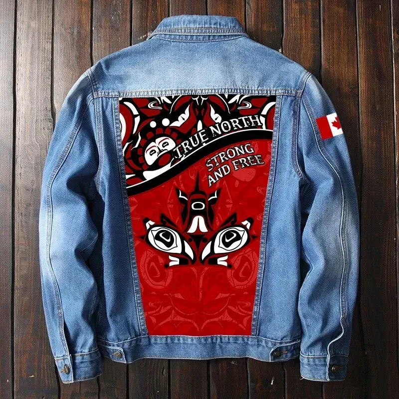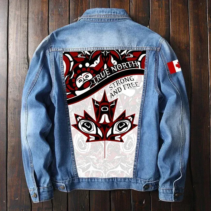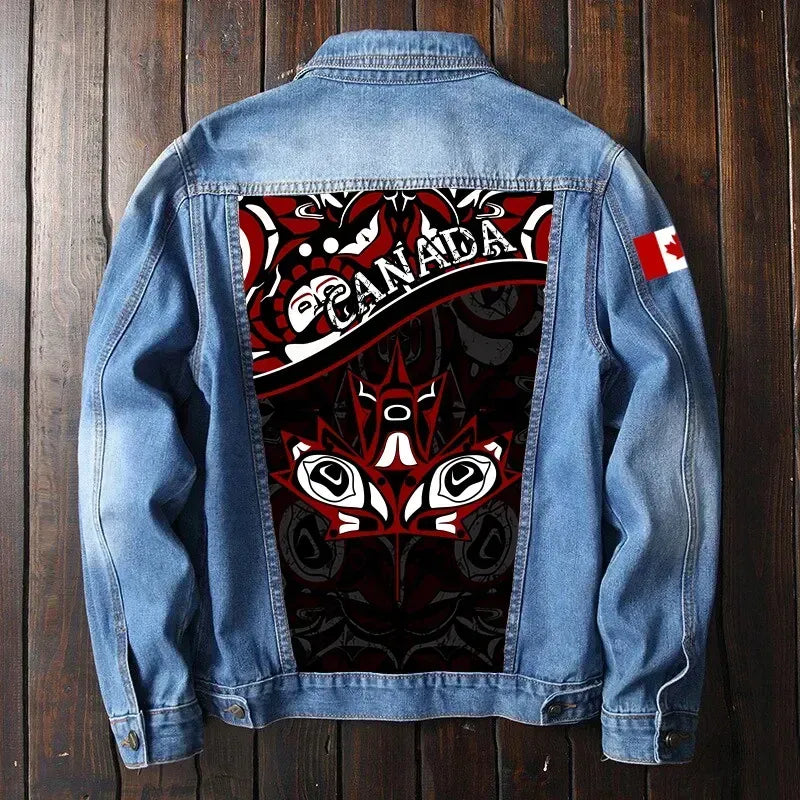 Canada Day Denim Jacket For Men And Women Haida Maple Leaf Tattoo Style