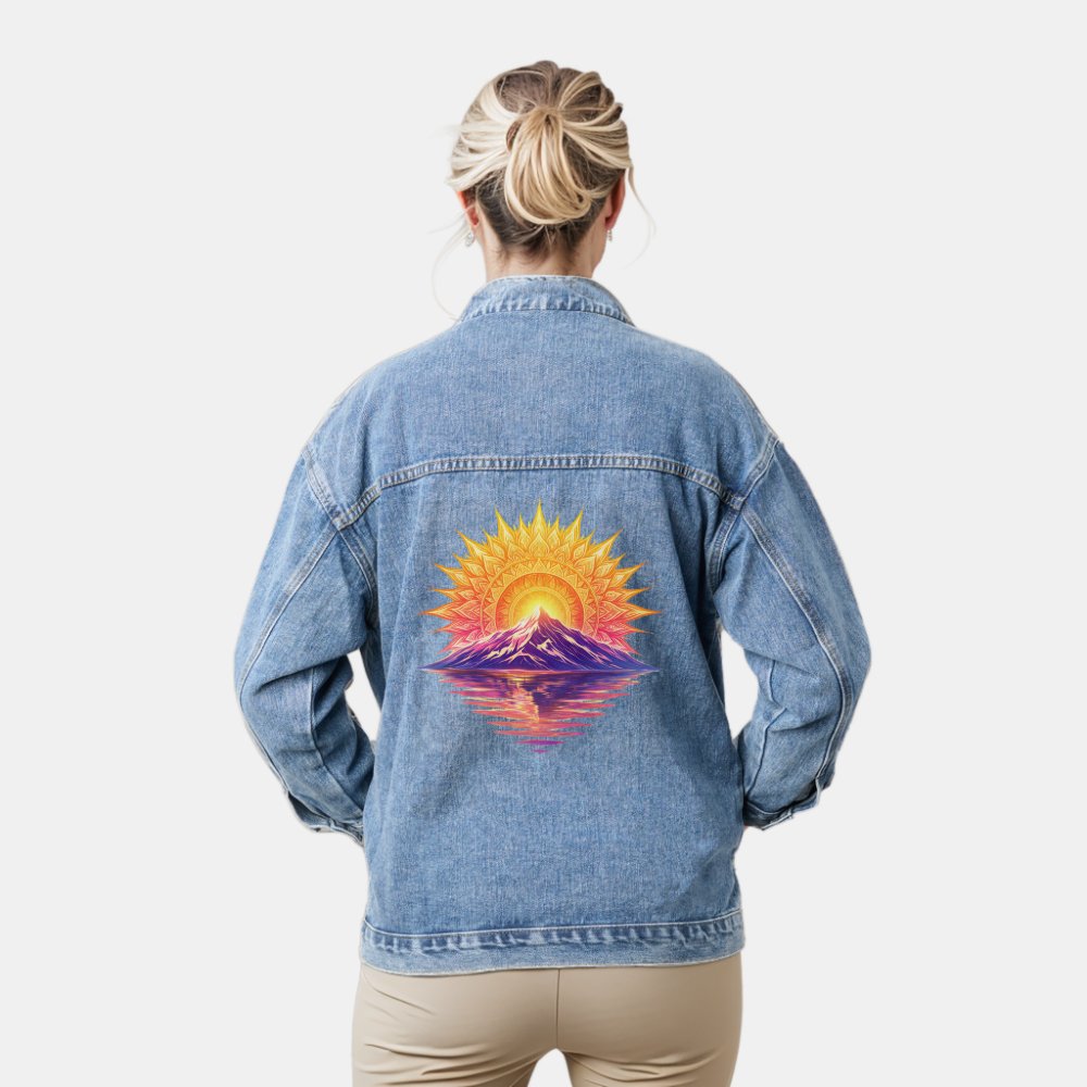 Golden Boho Mandala Sun Mountain Sunset Reflection Denim Jacket Best Outerwear Gift