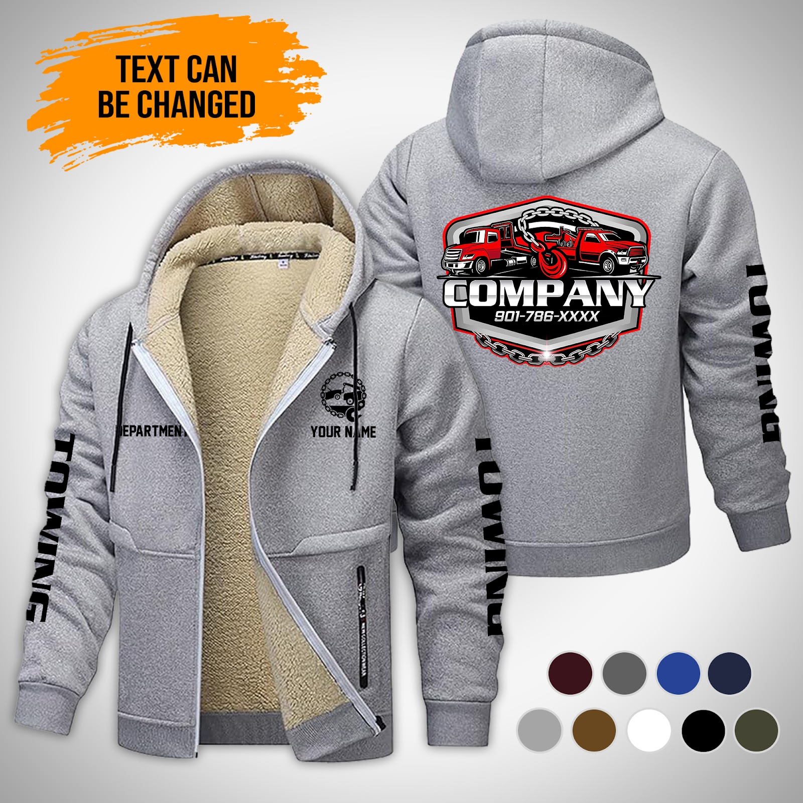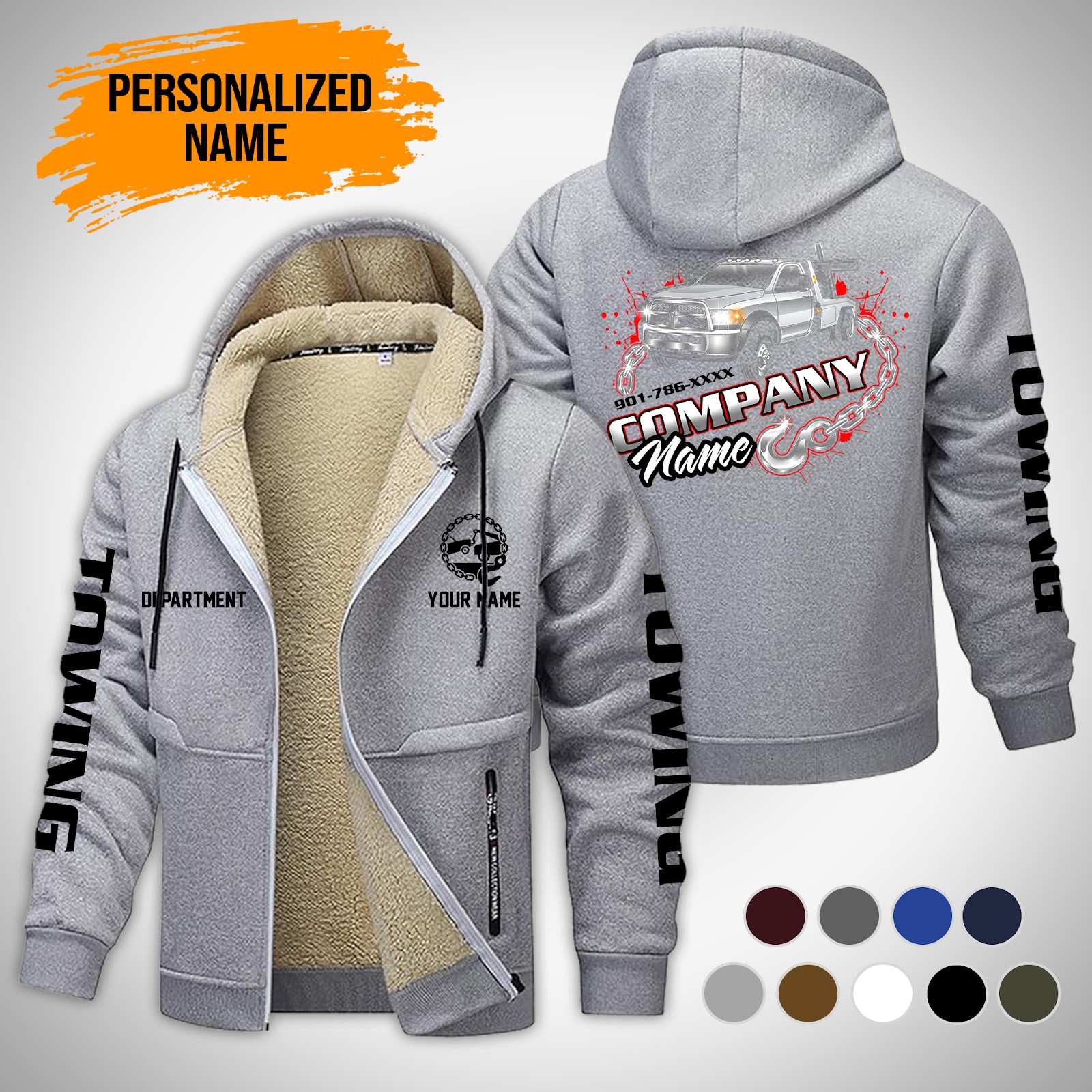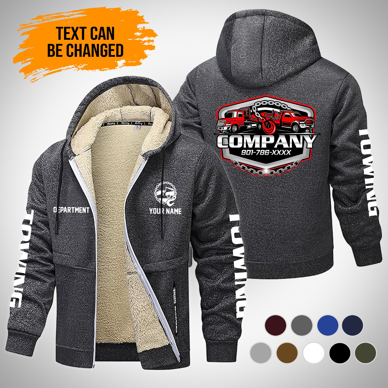 Personalized Name Tow Truck Lamb Fleece Thick Coat Dark Grey