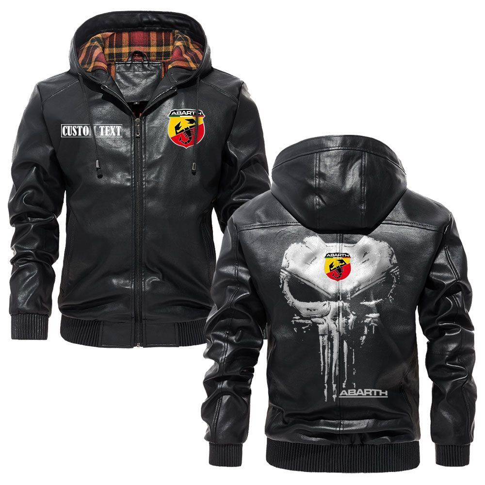 Abarth Logo Custom Name Leather Hoodie Jacket Warm Outerwear with Punisher Skull Design