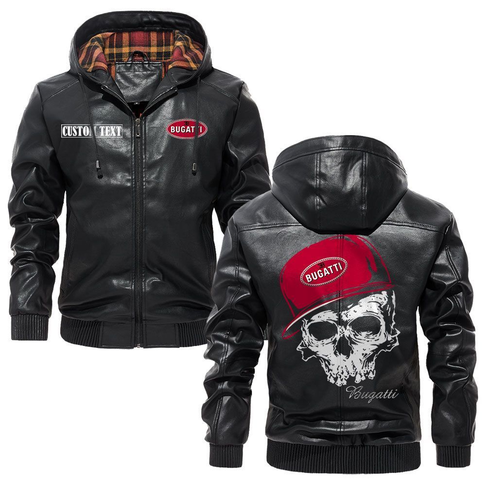 Bugatti Logo Custom Name Leather Hoodie Jacket Warm Outerwear with Skull Design