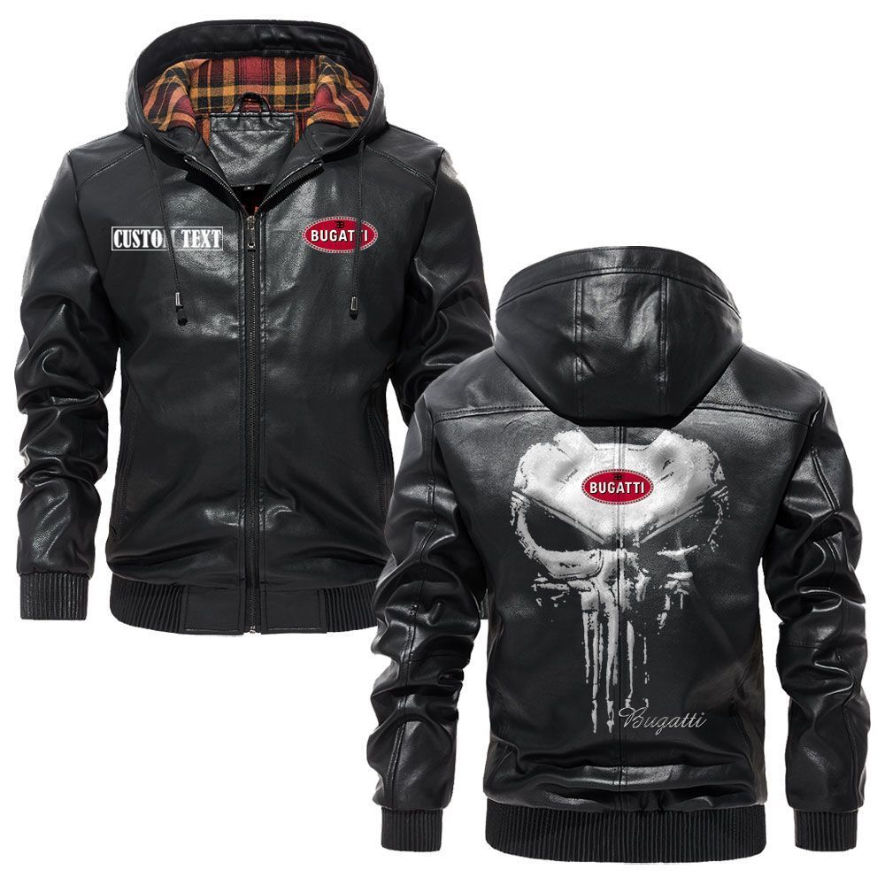 Bugatti Logo Custom Name Leather Hoodie Jacket Warm Outerwear with Punisher Skull Design