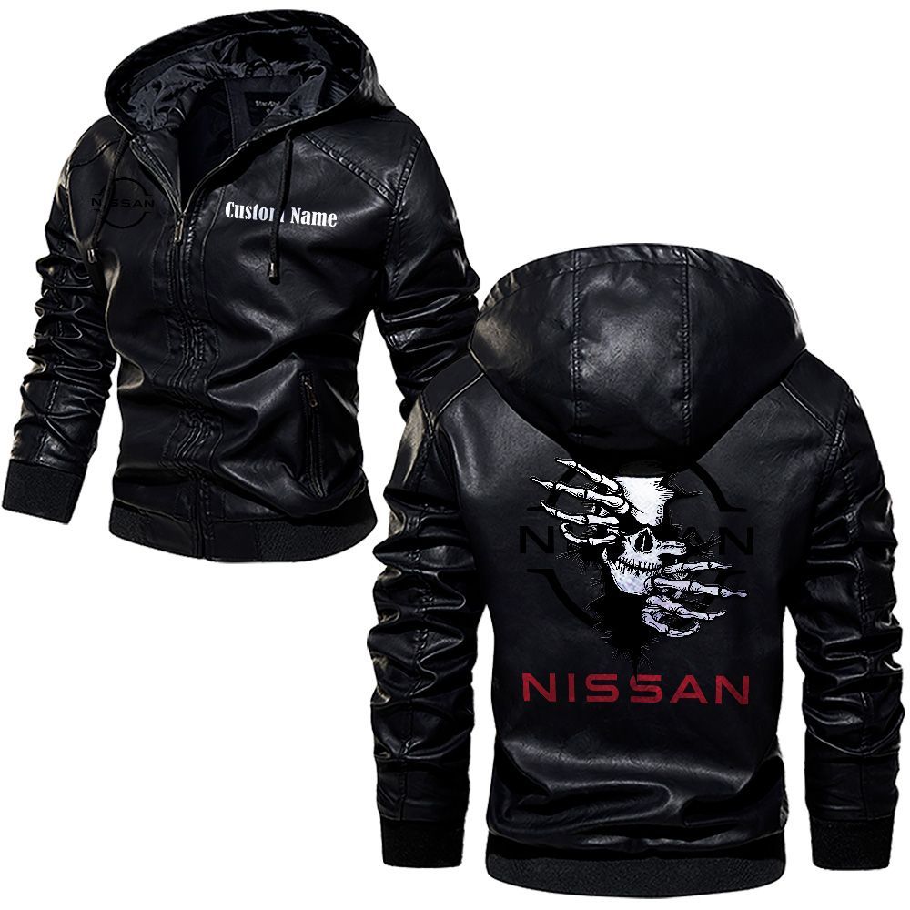 Nissan Logo Custom Name Leather Hoodie Jacket Warm Outerwear with Skull Design