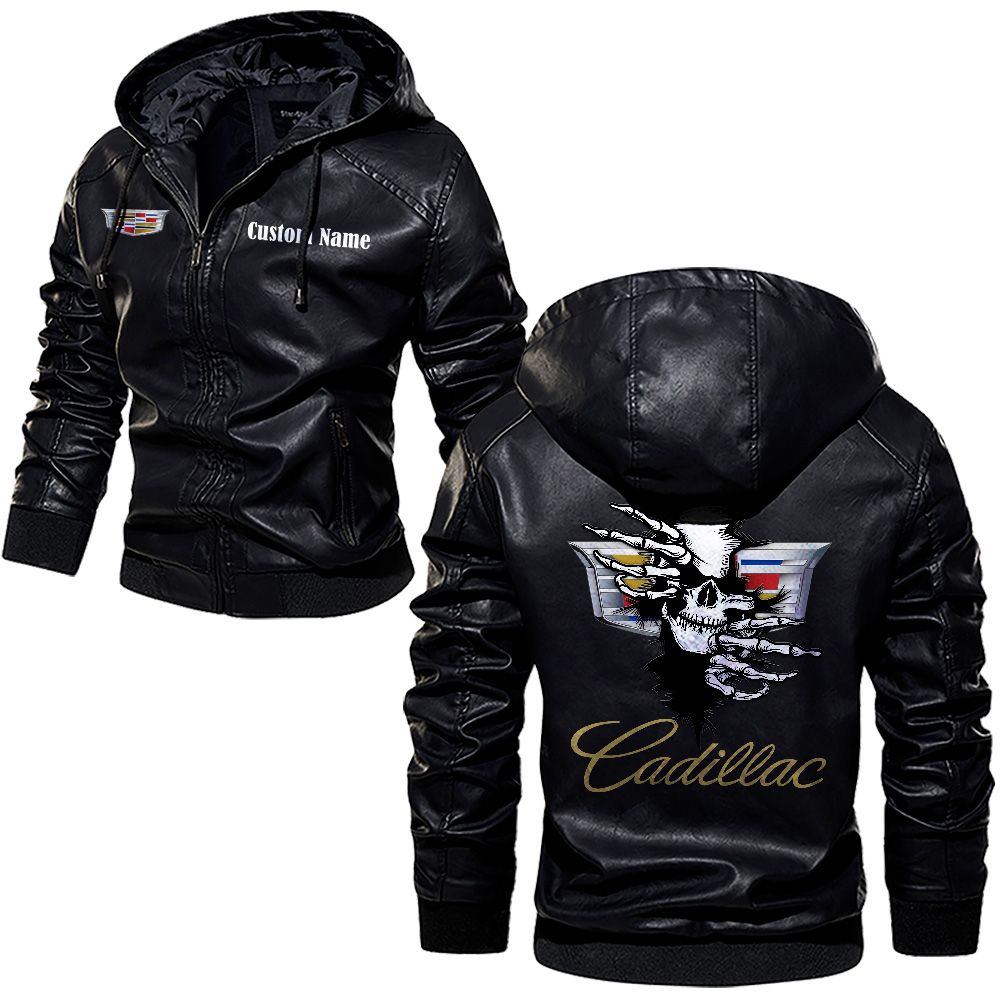 Cadillac Logo Custom Name Leather Hoodie Jacket Warm Outerwear with Skull Design