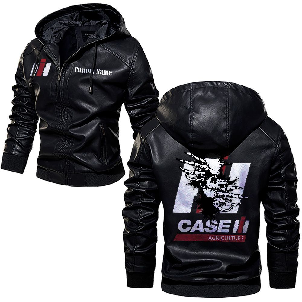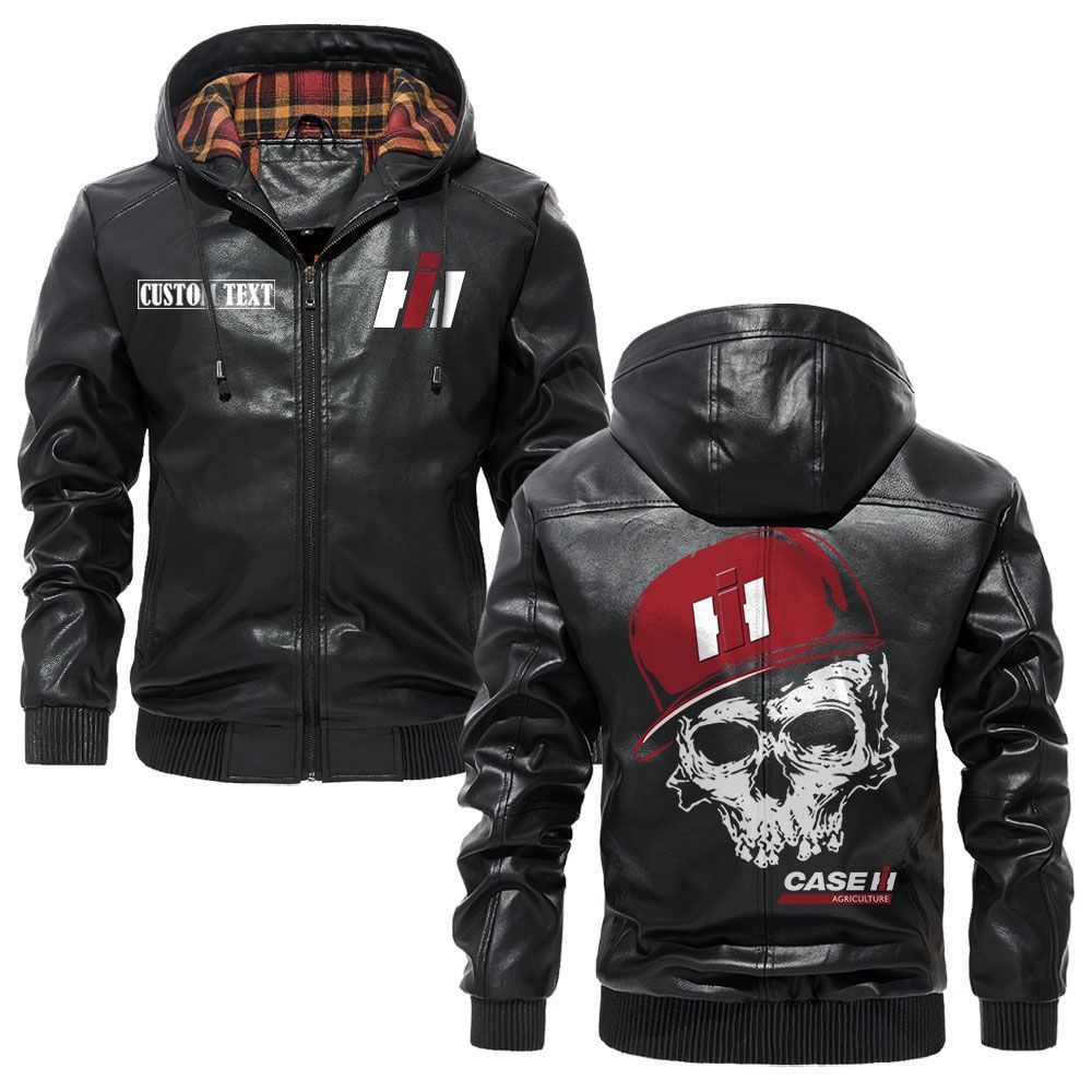 Case IH Logo Custom Name Leather Hoodie Jacket Warm Outerwear with Skull Design