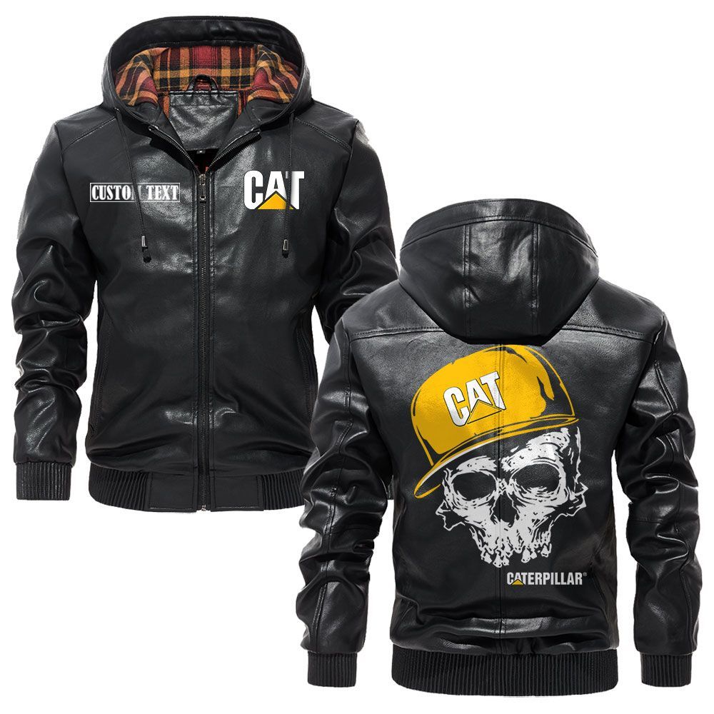 Caterpillar Inc Logo Custom Name Leather Hoodie Jacket Warm Outerwear with Skull Design