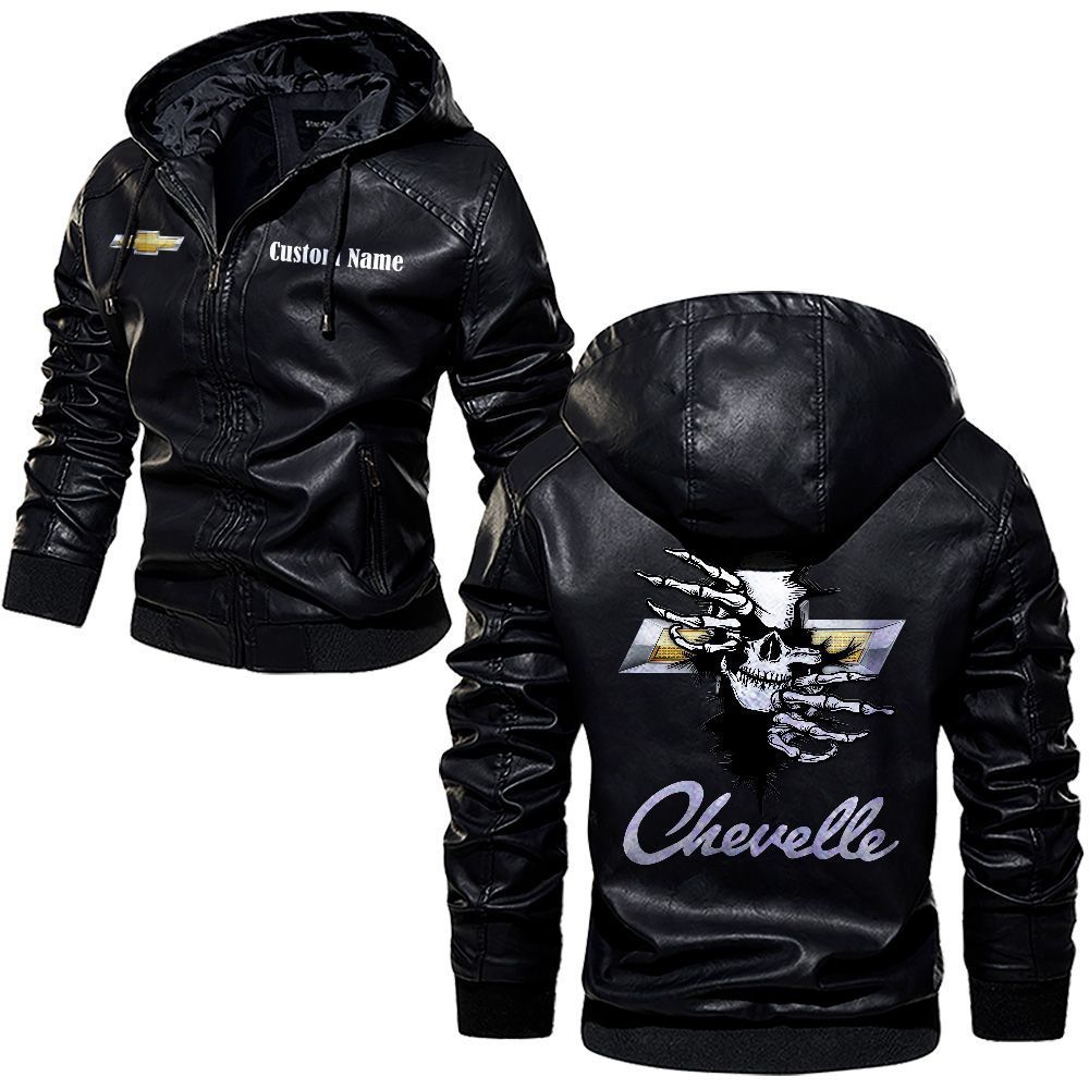 Chevrolet Chevelle Logo Custom Name Leather Hoodie Jacket Warm Outerwear with Punisher Skull Design