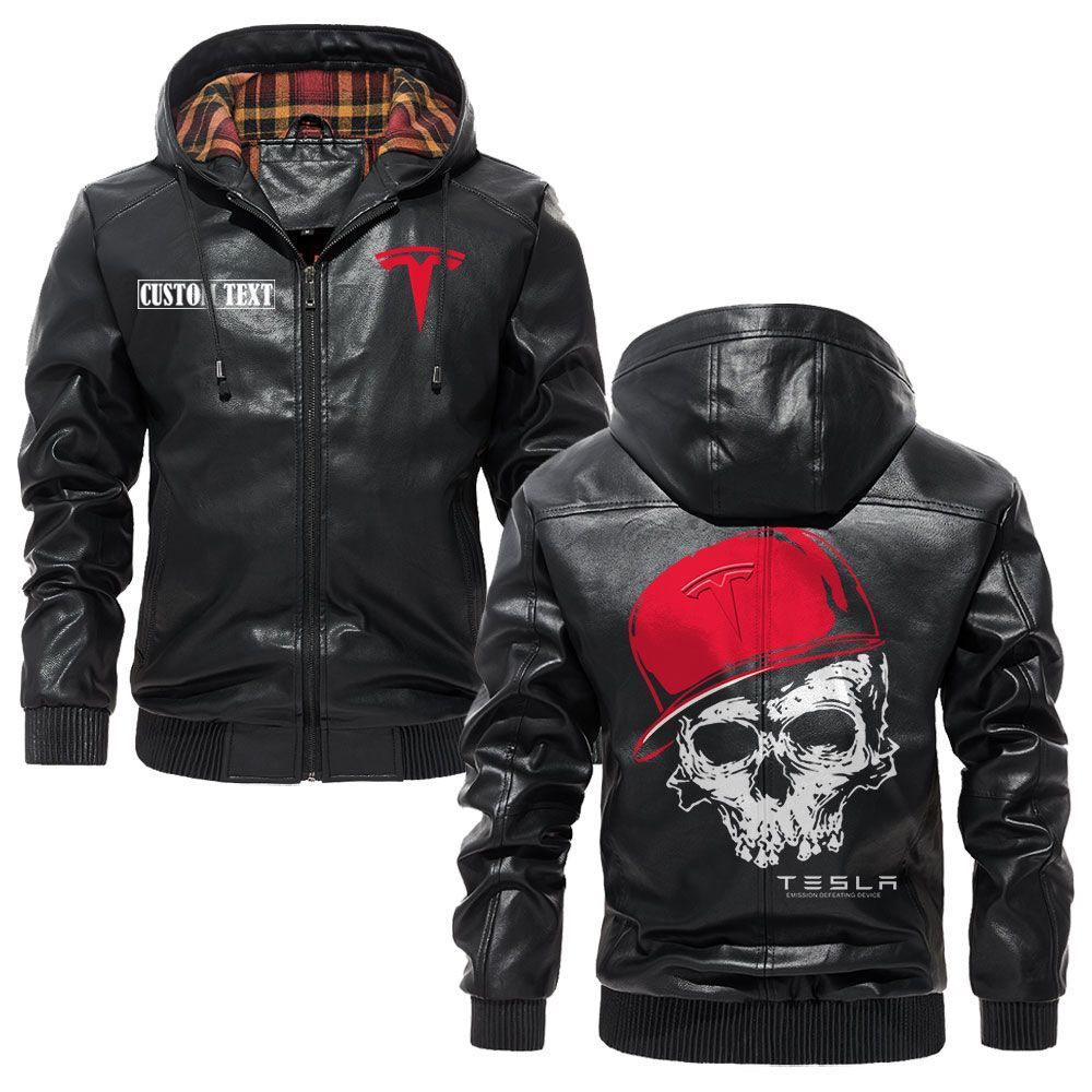 Tesla Motors Logo Custom Name Leather Hoodie Jacket Warm Outerwear with Skull Design