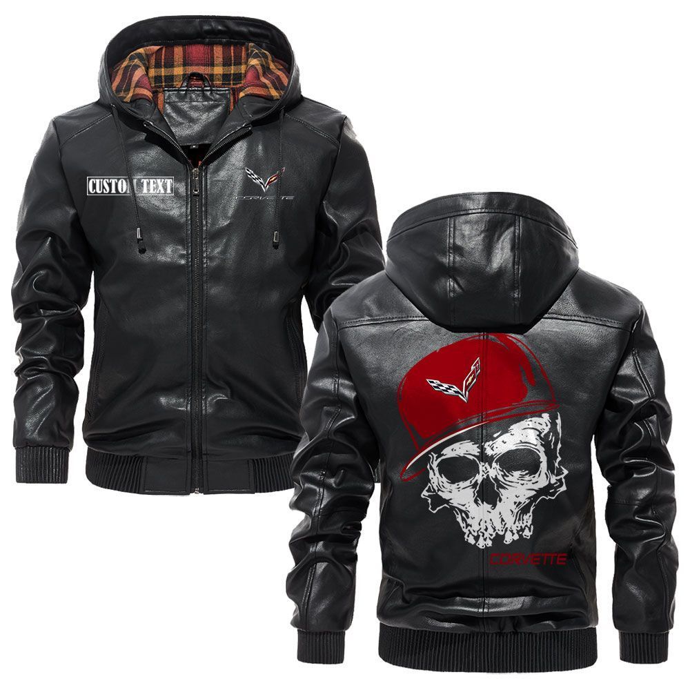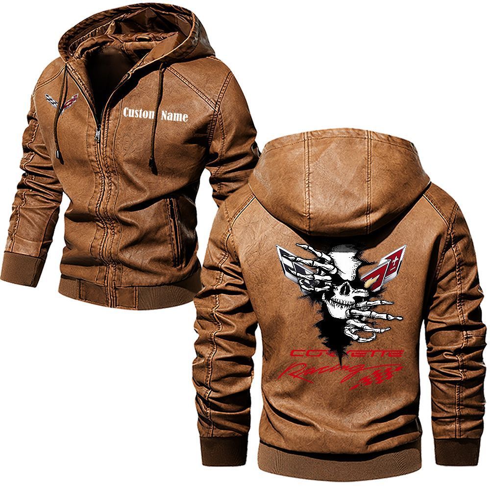 Chevrolet Corvette Logo Custom Name Leather Hoodie Jacket Warm Outerwear with Skull Design