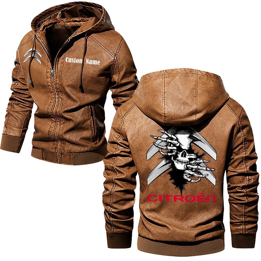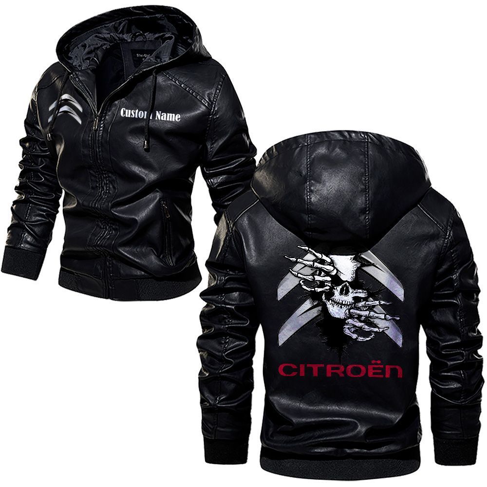 Citroen Logo Custom Name Leather Hoodie Jacket Warm Outerwear with Skull Design