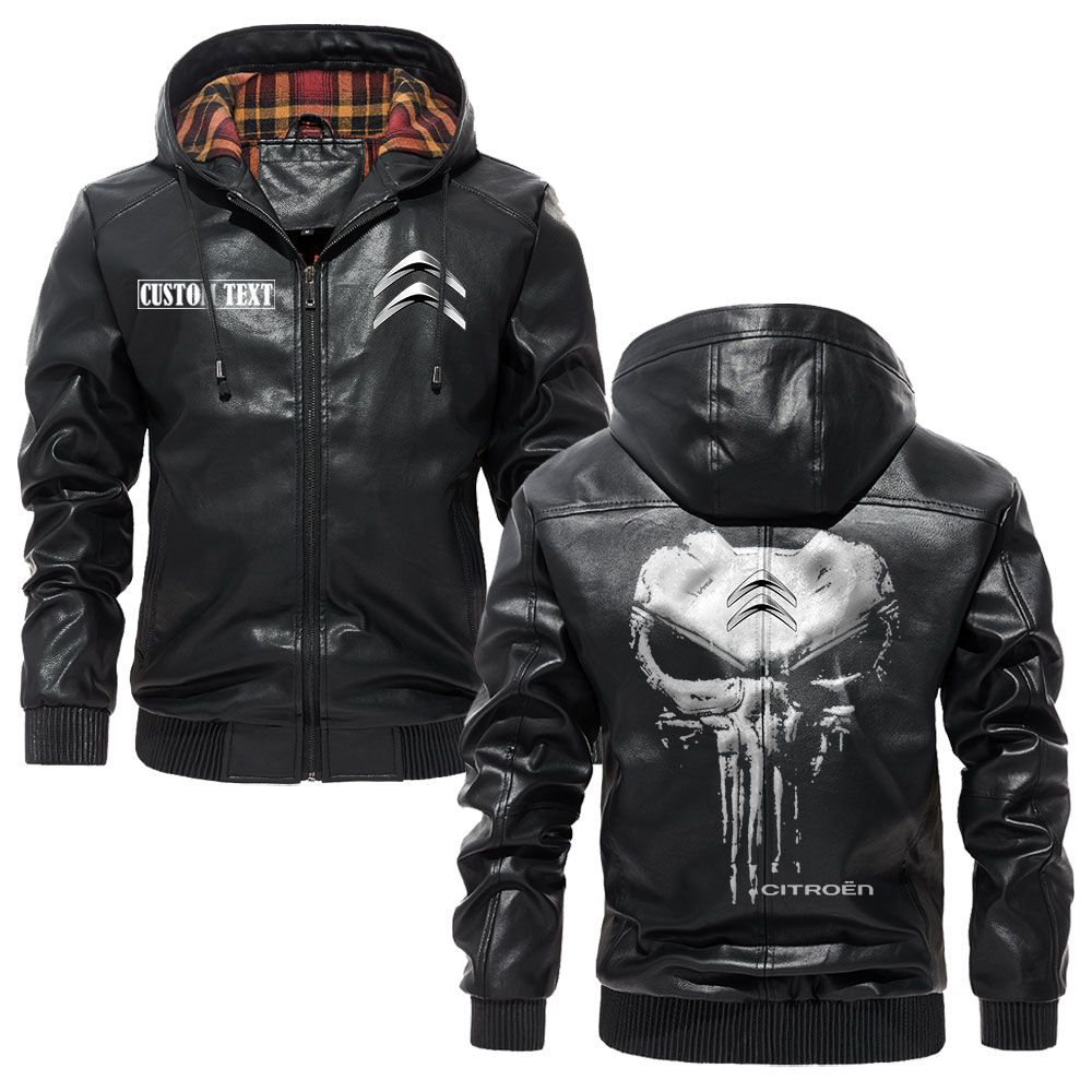 Citroen Logo Custom Name Leather Hoodie Jacket Warm Outerwear with Punisher Skull Design