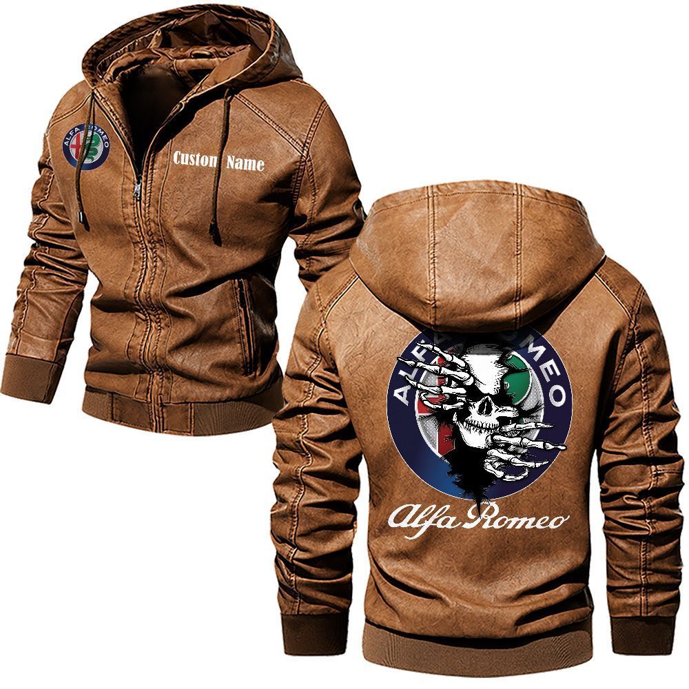 Alfa Romeo Logo Custom Name Leather Hoodie Jacket Warm Outerwear with Skull Design