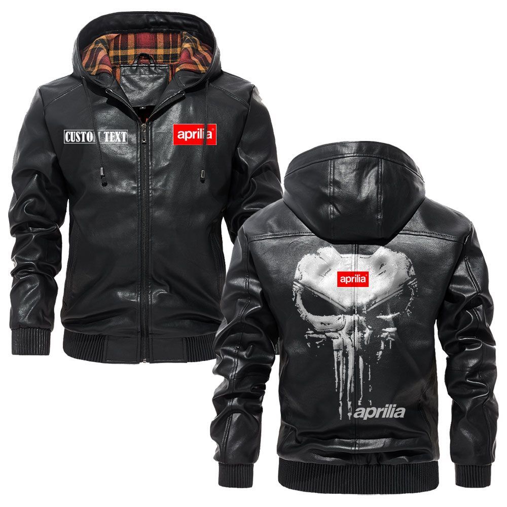 Aprilia Logo Custom Name Leather Hoodie Jacket Warm Outerwear with Punisher Skull Design