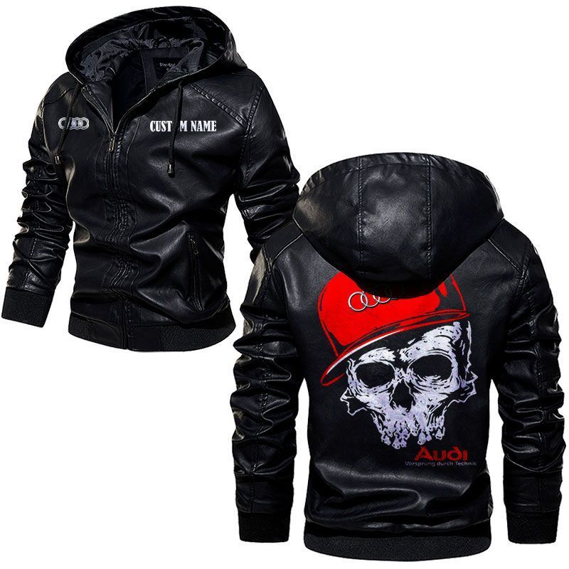 Custom Name Skull Design Audi-logo Leather Hoodie Jacket