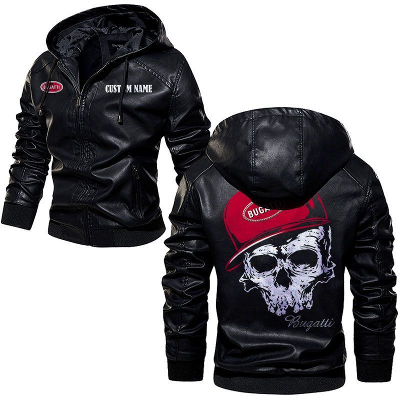 Custom Name Skull Design Bugatti Leather Hoodie Jacket