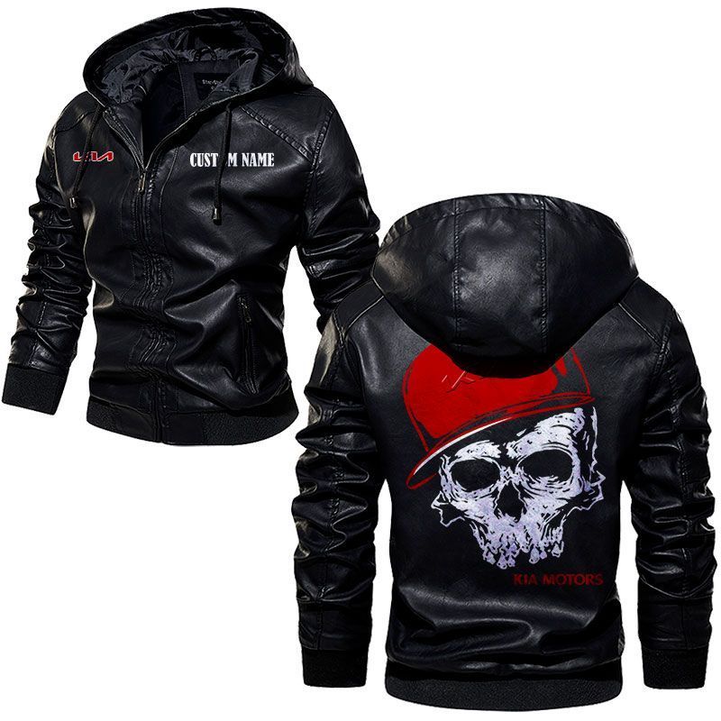 Custom Name Skull Design Kia Leather Hoodie Jacket
