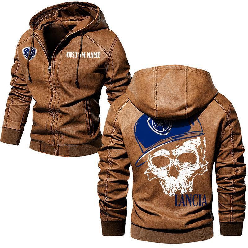 Custom Name Skull Design Lancia Leather Hoodie Jacket
