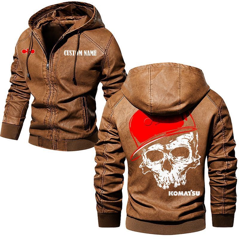Custom Name Skull Design Komatsu Leather Hoodie Jacket