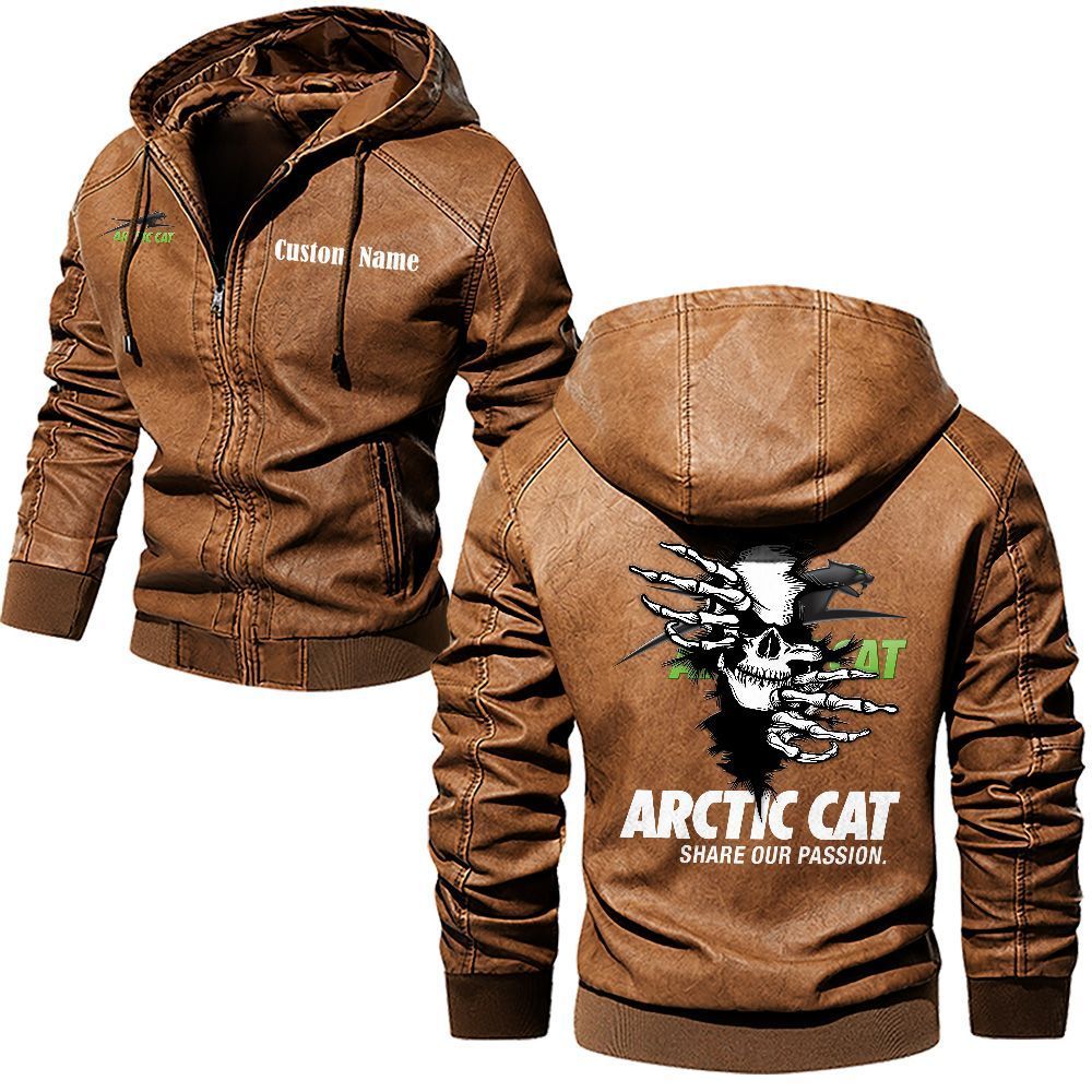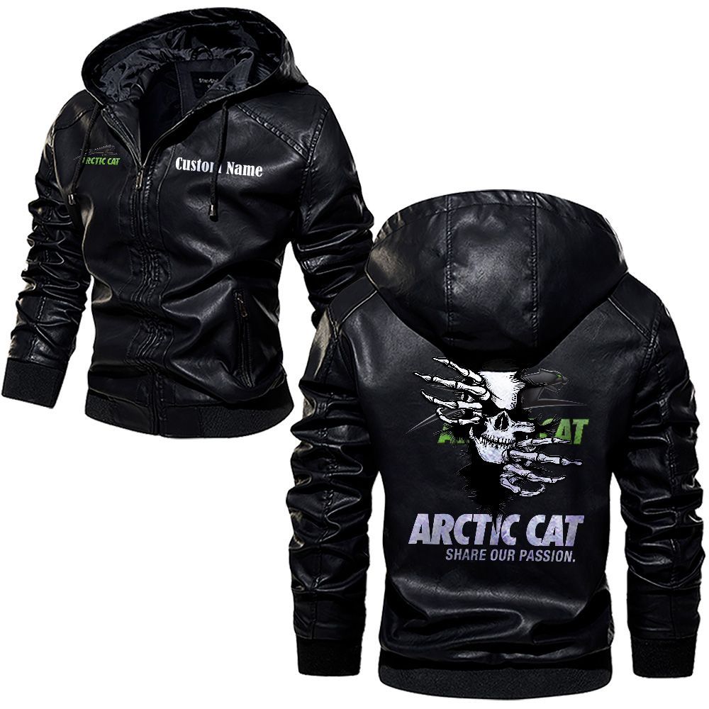 Arctic cat Logo Custom Name Leather Hoodie Jacket Warm Outerwear with Skull Design