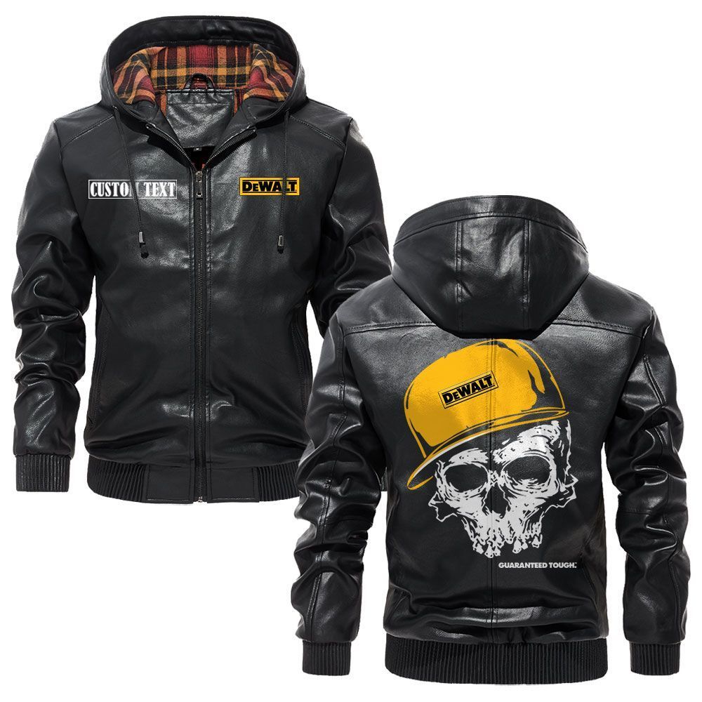 DeWalt Logo Custom Name Leather Hoodie Jacket Warm Outerwear with Skull Design