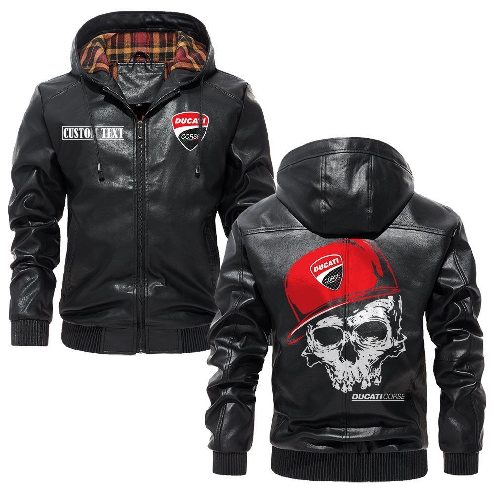 Ducati Corse Logo Custom Name Leather Hoodie Jacket Warm Outerwear with Skull Design