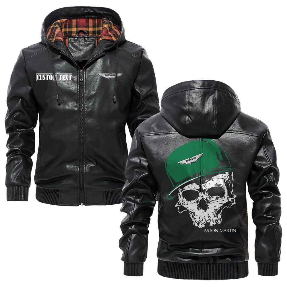 Aston Martin Logo Custom Name Leather Hoodie Jacket Warm Outerwear with Skull Design