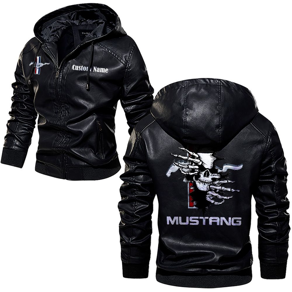 Ford Mustang Logo Custom Name Leather Hoodie Jacket Warm Outerwear with Punisher Skull Design