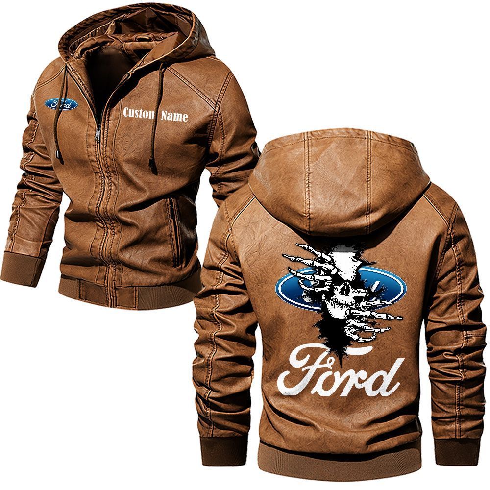Ford Motor Company Logo Custom Name Leather Hoodie Jacket Warm Outerwear with Skull Design