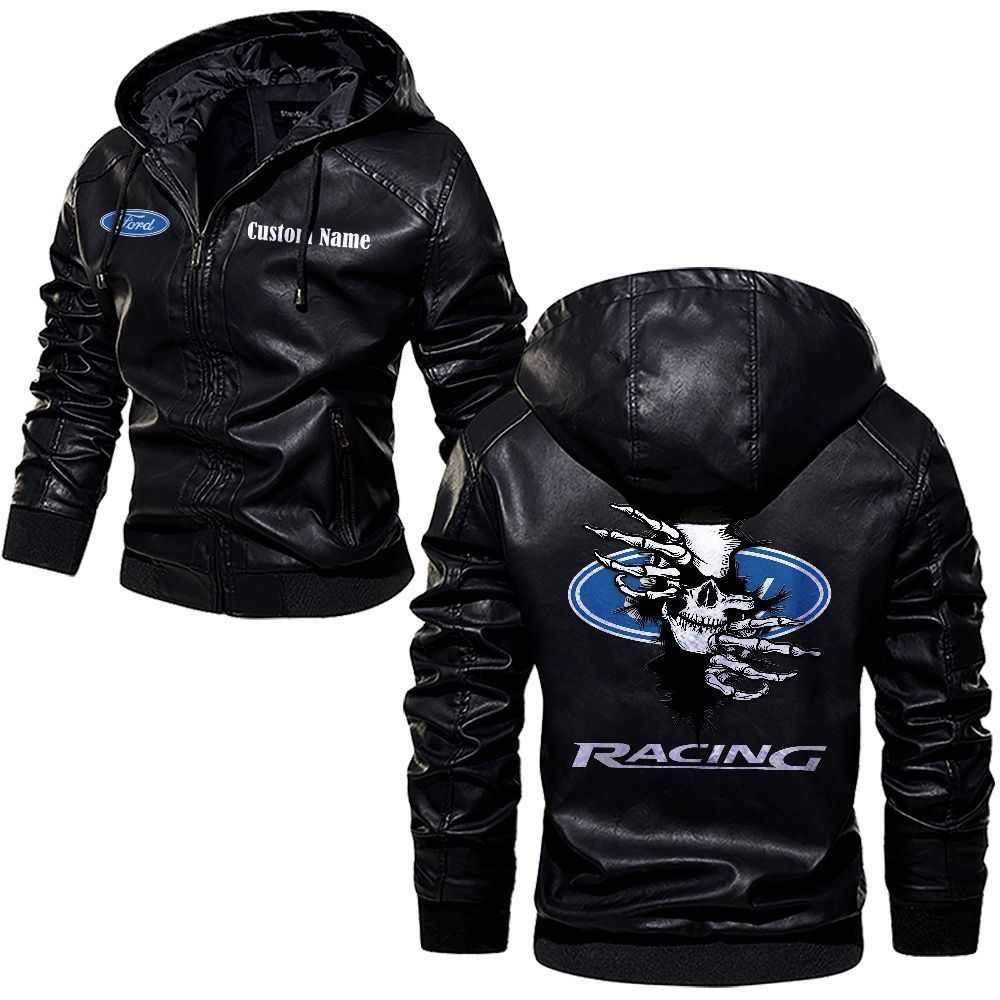 Ford Racing Logo Custom Name Leather Hoodie Jacket Warm Outerwear with Skull Design