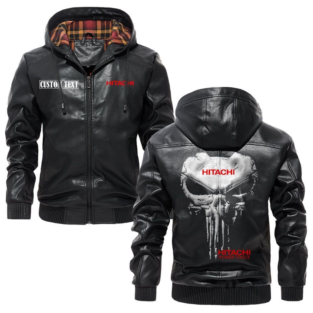 Hitachi Logo Custom Name Leather Hoodie Jacket Warm Outerwear with Punisher Skull Design