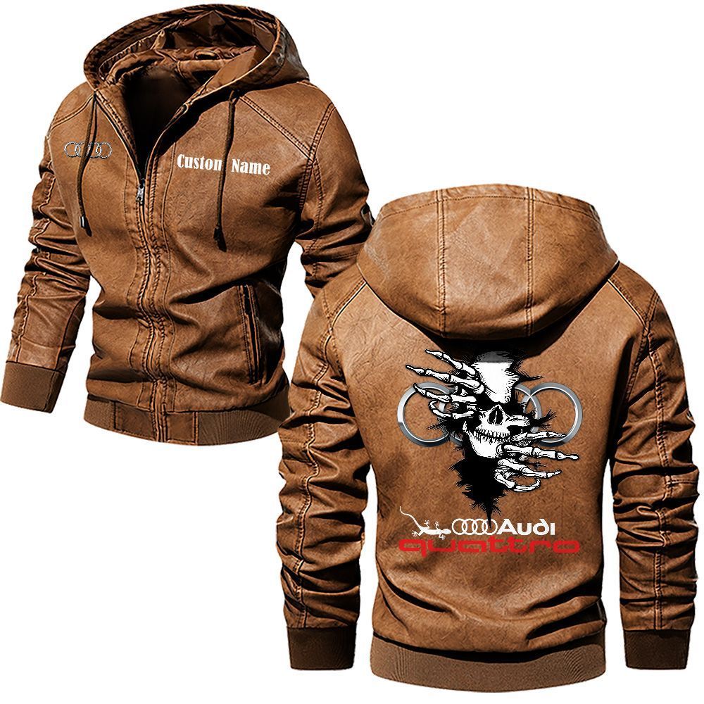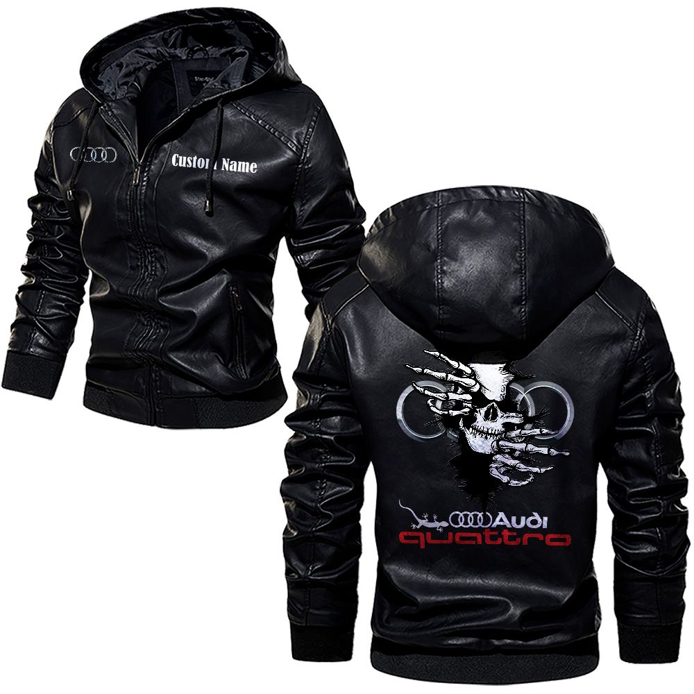 Audi Logo Custom Name Leather Hoodie Jacket Warm Outerwear with Skull Design