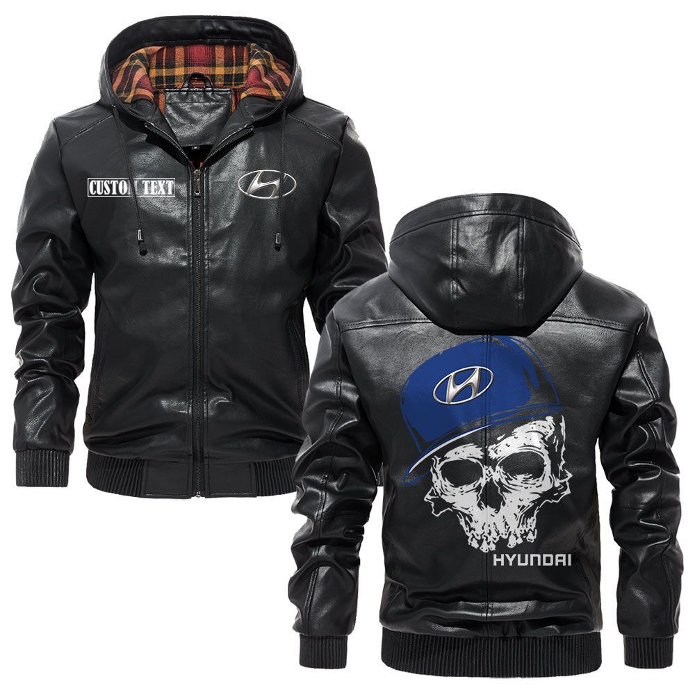 Hyundai Logo Custom Name Leather Hoodie Jacket Warm Outerwear with Skull Design