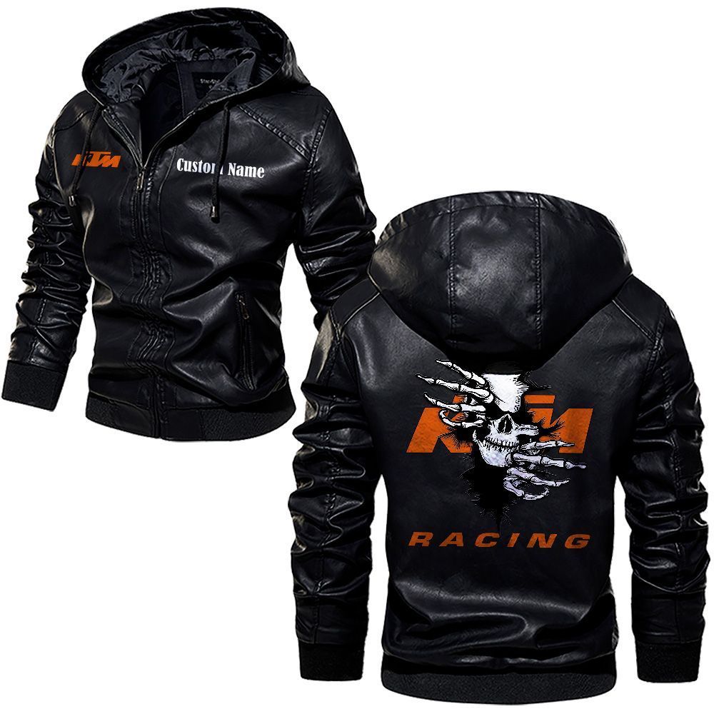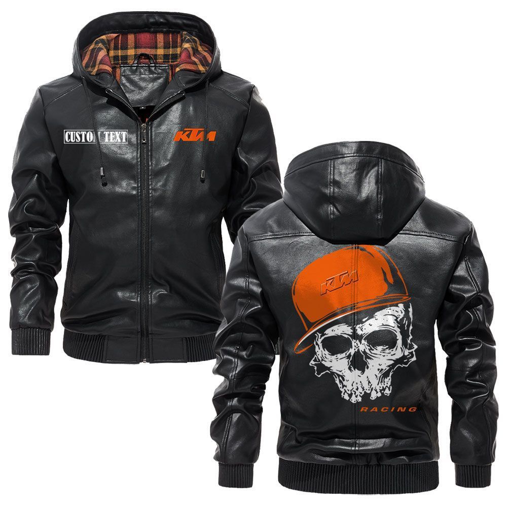 KTM Logo Custom Name Leather Hoodie Jacket Warm Outerwear with Skull Design