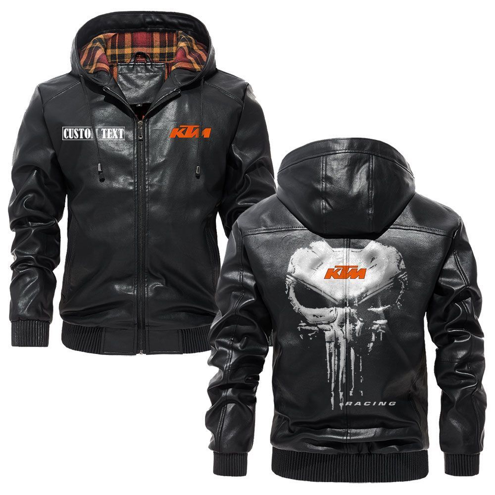 KTM Logo Custom Name Leather Hoodie Jacket Warm Outerwear with Punisher Skull Design