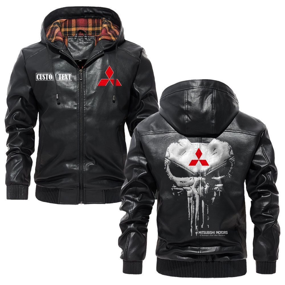 Mitsubishi Logo Custom Name Leather Hoodie Jacket Warm Outerwear with Punisher Skull Design