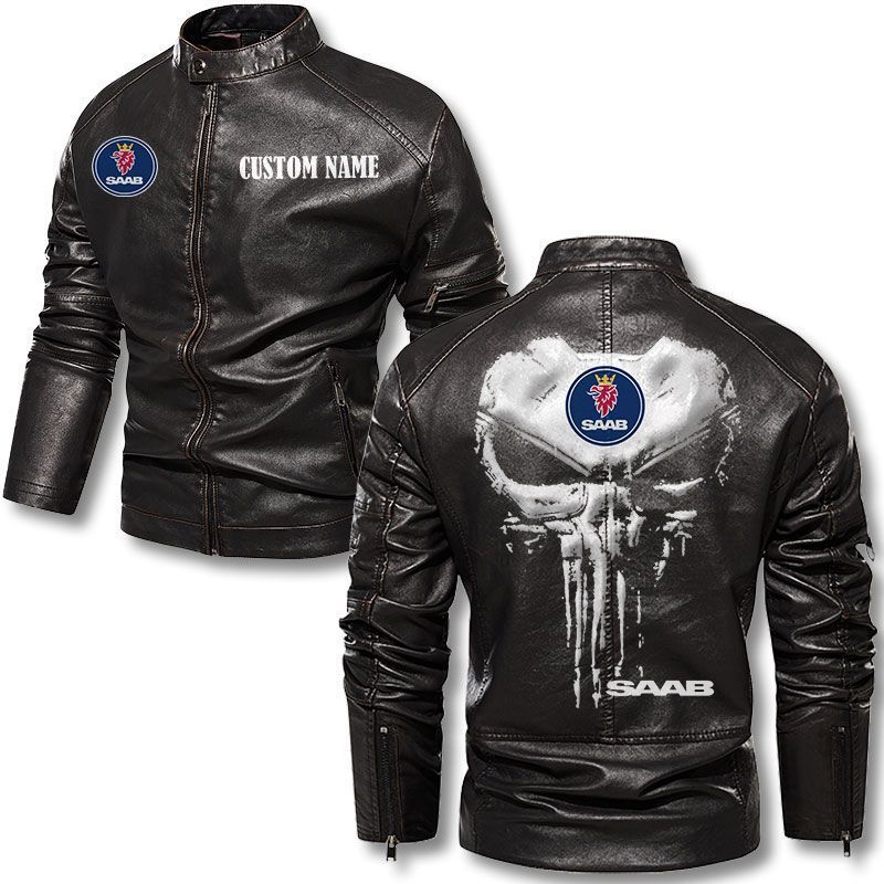 Custom Name Punisher Skull SAAB Motorcycle Leather Jacket
